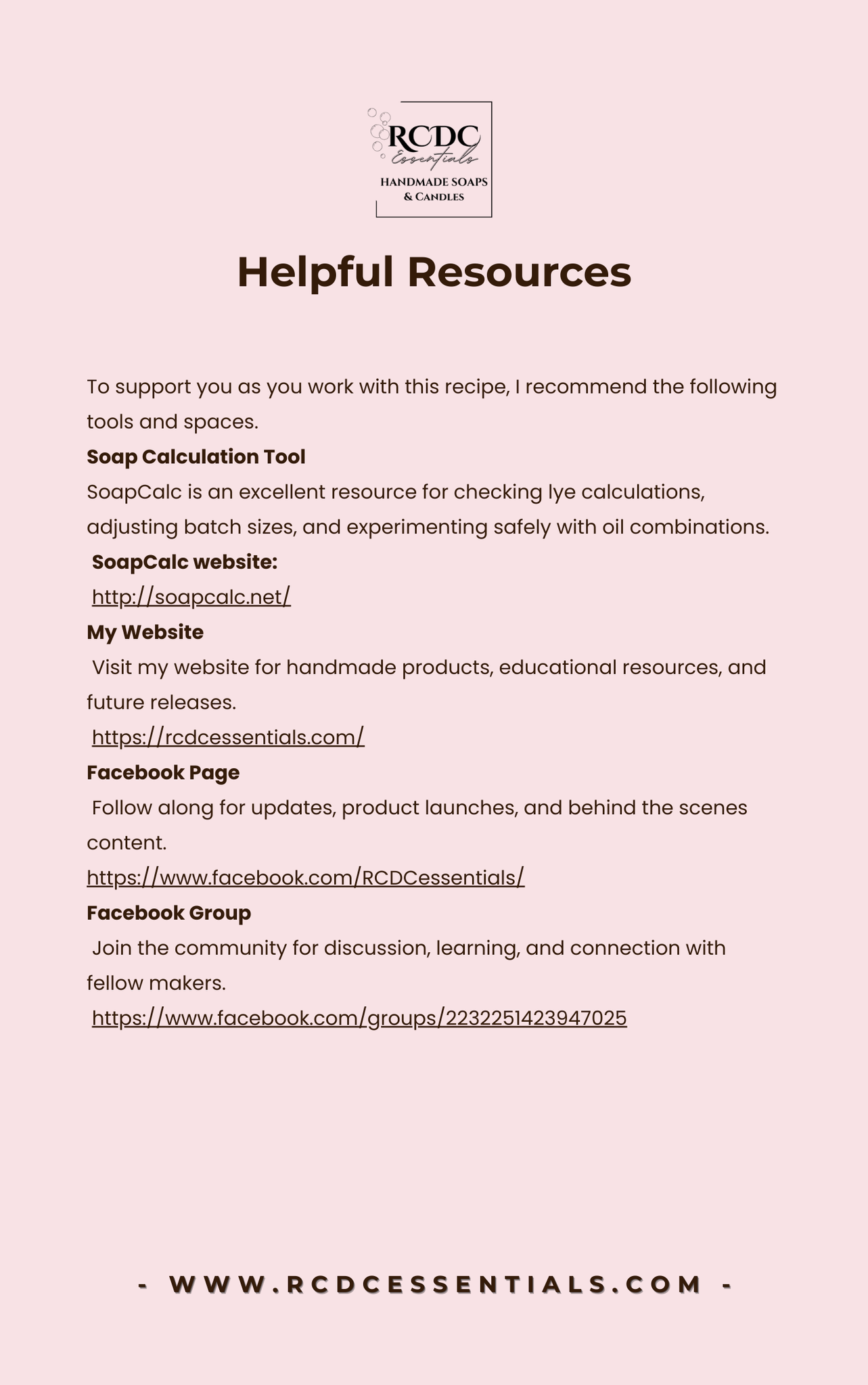 This downloadable soap recipe PDF is built from years of hands on soap making experience and real world testing. It is a balanced, reliable base recipe that I personally use and stand behind, designed to give you confidence without limiting your creativity.