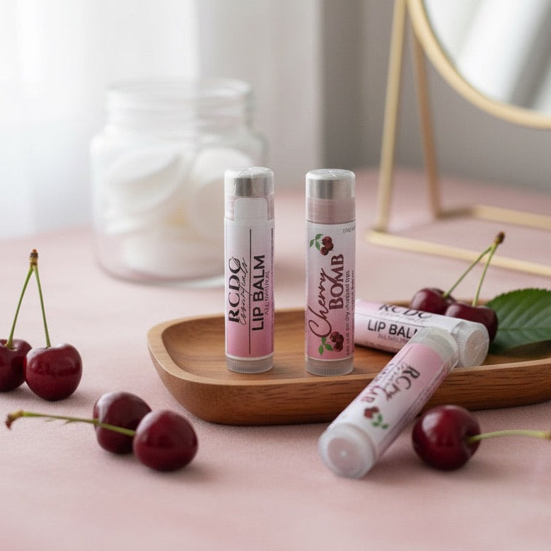 Three lip balms on a wooden tray with cherries and a mirror in the background