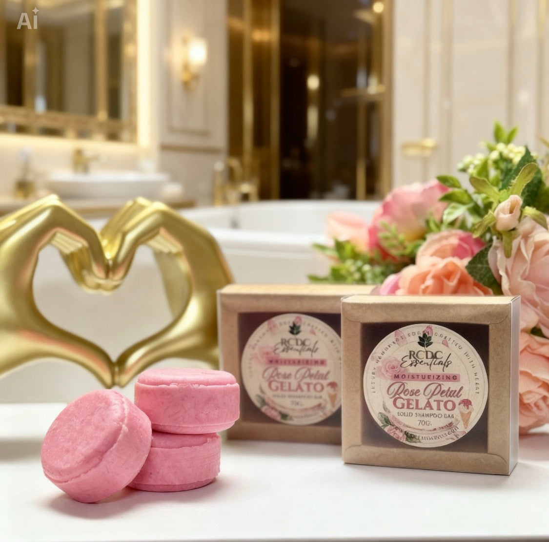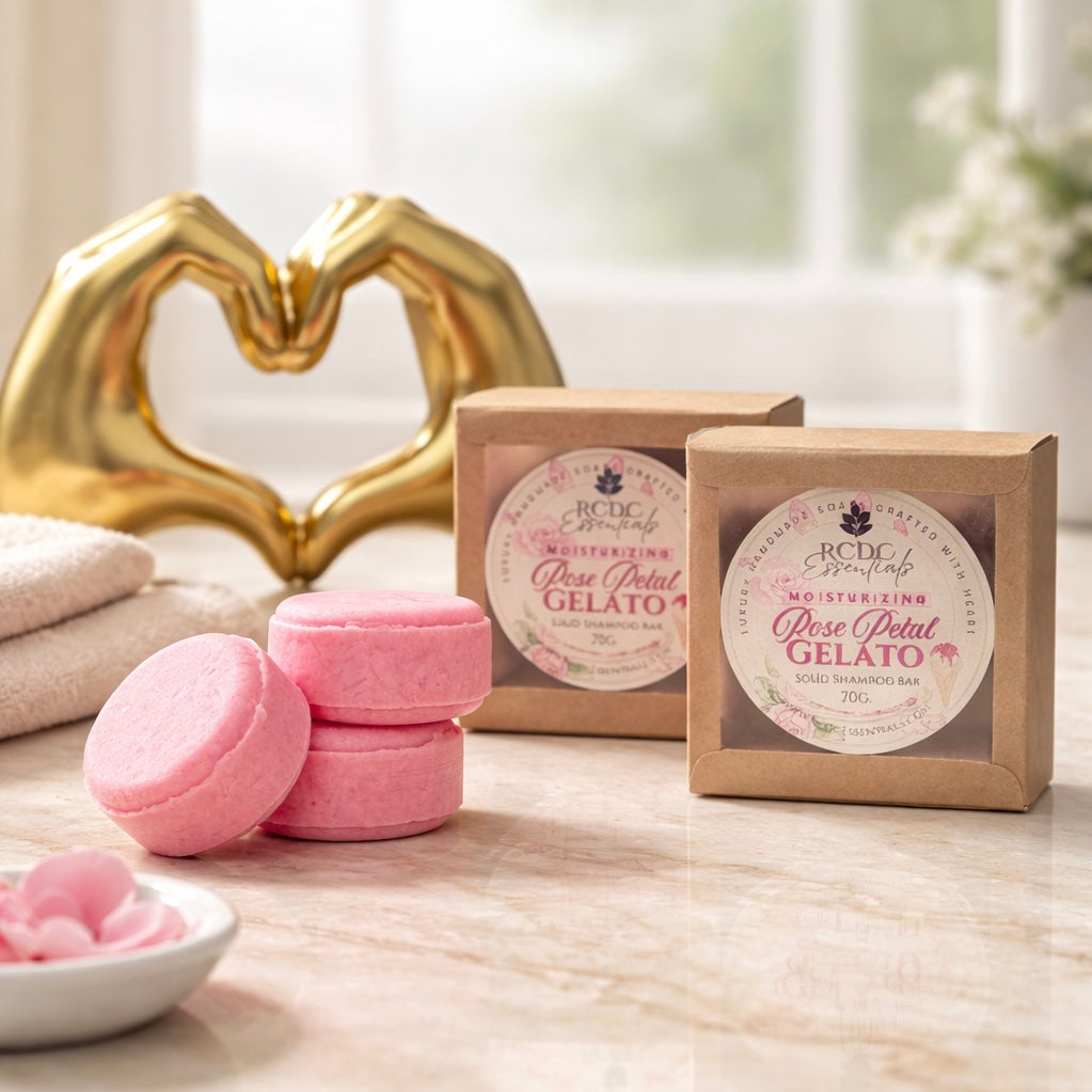 RCDCessentials Rose Petal Gelato moisturizing solid shampoo bars in kraft window packaging displayed on bathroom counter