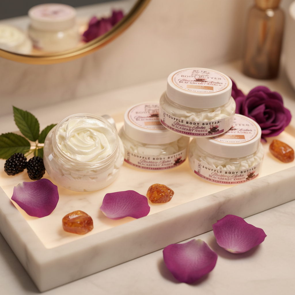 Enjoy the charming mix of bergamot, cozy amber, juicy blackberries, and cassis in this Blackberry Amber ~ Soufflé Body Butter!